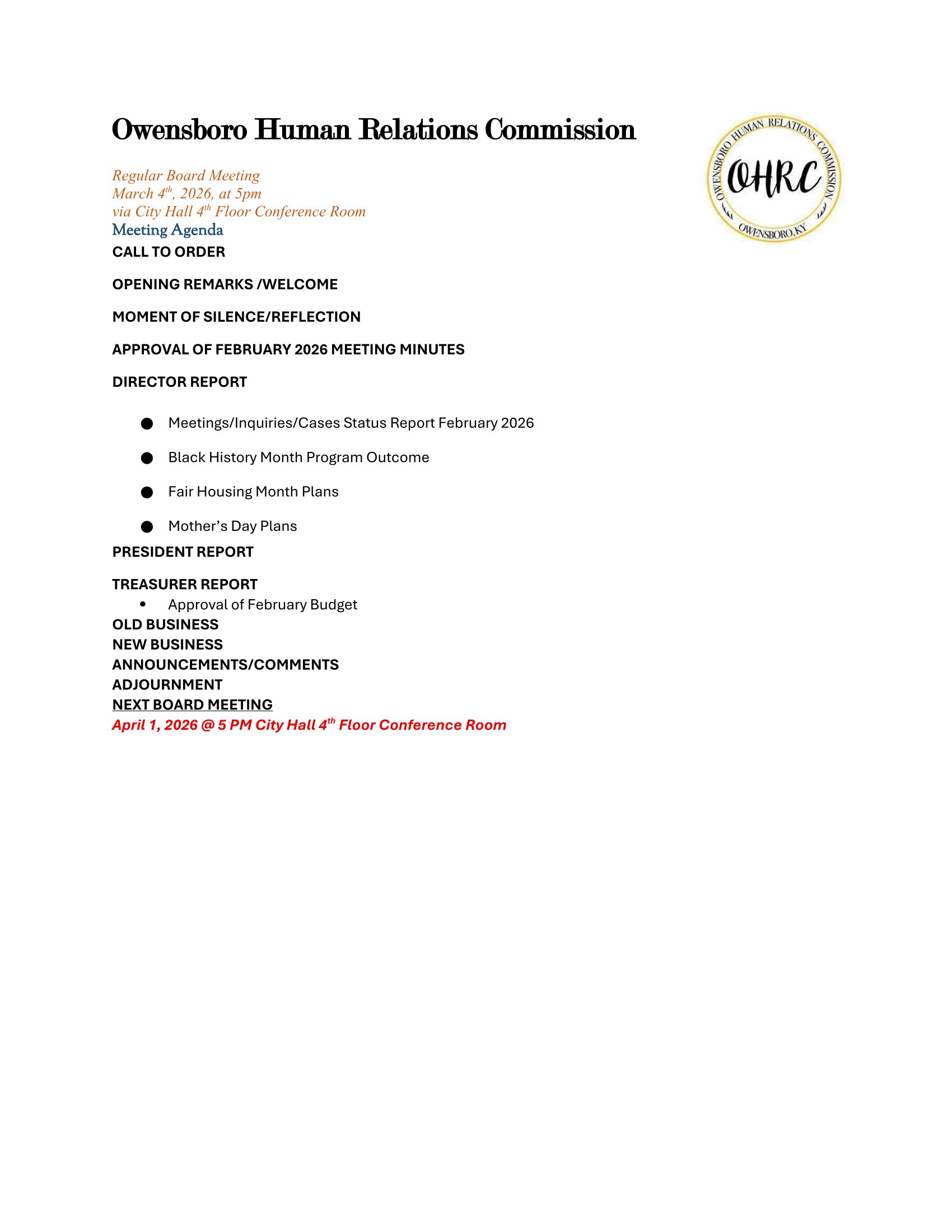 The meeting will be held via video teleconference and held in accordance with KRS 61.826 and the primary location for the meeting will be at City Hall, 101 E. 4th Street, 4th Floor Board Room, Owensboro, KY @ 5:00pm.