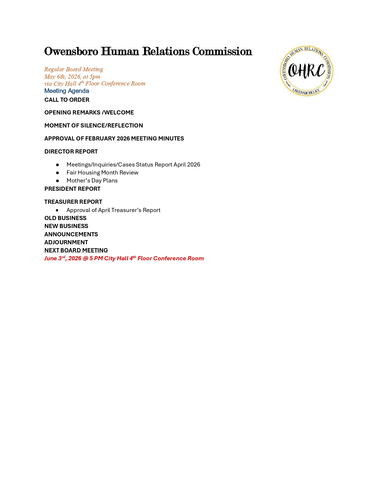 The meeting will be held via video teleconference and held in accordance with KRS 61.826 and the primary location for the meeting will be at City Hall, 101 E. 4th Street, 4th Floor Board Room, Owensboro, KY @ 5:00pm.